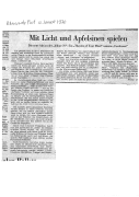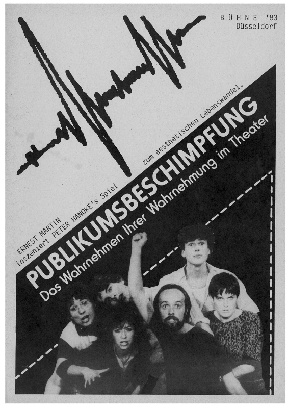 1983 stand ein weiteres Stück eines modernen Autoren auf dem Programm der „Bühne“. Gespielt wurde die „Publikumsbeschimpfung“ von Peter Handke. Eine kleine Sensation war allein schon die Tatsache, dass es Ernest Martin gelungen war, vom Autor die Aufführungsrechte für seine Düsseldorfer Inszenierung erhalten zu haben. Peter Handke hatte das Stück wenige Jahre nach seiner Uraufführung 1966 in Frankfurt für weitere Aufführungen gesperrt, weil die Reaktionen des Publikums auf die „Beschimpfungen“ Ende der sechziger Jahre sehr aggressiv ausgefallen waren. Handke behandelt in seinem Spiel die Negation des herkömmlichen Theaters, das nach seiner Ansicht von den mehr oder weniger unverhohlenen Erwartungshaltungen des Publikums bestimmt wird. Insgesamt hat das Stück eine paradoxe Grundstruktur. In allen Beiträgen der Akteure kommt unterschwellig die Botschaft zum Ausdruck „Wir spielen nicht“, obwohl sie auf einer Bühne vor Publikum stehen. Die Entfaltung dieses Paradoxes war die Herausforderung für die Inszenierung. Ernest Martin löste dieses Problem, indem er dauernd eine Beziehung zwischen gesprochenem Text und den Bewegungen der Akteure herstellte. „Durch das betont körperliche Spiel seiner sechs Darsteller erhalten die paradoxen Aussagen eine komische Dimension, Der Erfolg bei den Zuschauern gibt dieser Interpretation recht. Während die Wortkaskaden ständig suggerieren, dass auf der Bühne nur geredet werde, erzählen die Gesichter und Gesten der Schauspieler witzige und bizarre Geschichten.“ („Rheinische Post“ vom 28. November 1983). „Dies geschieht so: die eine Hälfte trägt im Sprechchor vor, während die andere in persiflierender Pantomime vorführt, über welches Theater-Phänomen gerade gesprochen wird. (...)So erfährt der Zuschauer aufs lebendigste, was Theater eigentlich ist, an welche Voraussetzungen, Muster und Klischees er sich da längst gewöhnt hat und die er immer wieder vom Theater erwartet. Da wird gezeigt, was Spielzeit und gespielte Zeit ist, wie die Wahrnehmung des Zuschauers geregelt ist und wie die Illusion einer gespielten Wirklichkeit entsteht. Alles das, ohne auch nur eine Spur von Langeweile aufkommen zu lassen – das ist didaktisches Showtheater at it`s best!“ („Pinboard“ vom Jamuar 1984). Auch die Beleidigungen des Publikums, das etwa als „Miststücke“ und „Jammerlappen“ beschimpft und mit Aussagen wie „Sie haben kein Gespür für das Theater“ oder „Sie sind ein dramaturgischer Fehlgriff“ konfrontiert wird, werden stets ironisch entschärft. „Die Beschimpfung wird aber derart komisch, spielwitzig, ja, sogar selbstironisch vorgetragen, dass man sich nicht ernsthaft beleidigt fühlen kann. Die Provokation bleibt stets als Spiel erkennbar. Was die Truppe in langen Improvisationsübungen an komödiantischen Effekten und situationskomischen Szenen erarbeitet hat, verblüfft durch seine Unverkrampftheit. Mit professioneller Sicherheit fügen sich alle in Martins strenge Gruppenchoreographie. (...)Neben mehrfachem Szenenapplaus am Ende fast schon frenetischer Beifall“ („Rheinische Post“ vom 28. November 1983). |