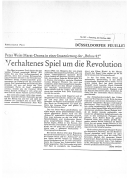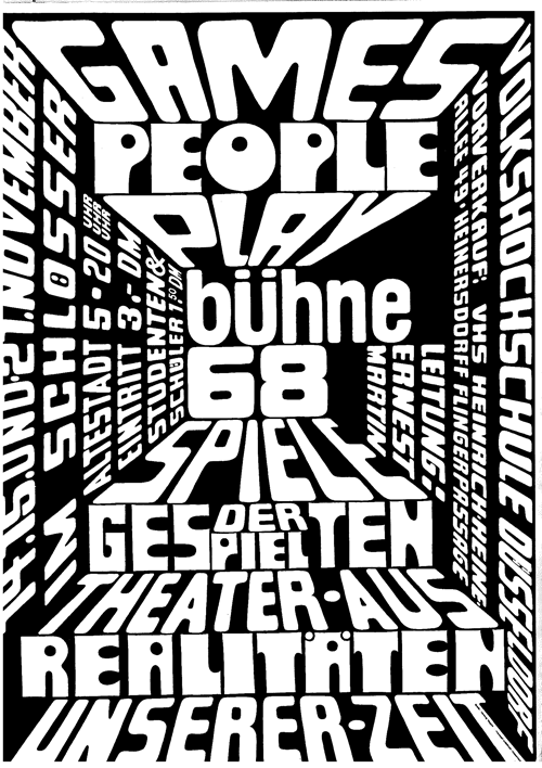 Im gleichen Jahr 1968 stellte die „Bühne“ eine weitere Eigenproduktion mit dem Titel „Games people play – Spiele der Gespielten“ der Öffentlichkeit vor. Das Aktionsfeld war nach dem Muster eines Brettspiels angelegt, auf dem vier Parteien miteinander konkurrierten: die Konservativen, im herkömmlichen Denken Befangenen waren die Schwarzen, die Vertreter der politischen Mitte die Weißen, die Revolutionäre und Utopisten die Roten, die Hippies und Anhänger des Trips nach innen die Gelben. Gemäß den Zahlen eines Glücksrads durften die Anhänger der jeweiligen Partei felderweise vorrücken. Dabei galt es, vier Krisenfelder zu überwinden: 1. Soziale Umwälzung; 2. Die Vergangenheit, die jedem anhaftet; 3. Krieg, den keiner will; 4. Frieden, mit dem wir nicht fertig werden. Wenn Krisenfelder betreten wurden, entschied das Ziehen einer Spielkarte darüber, ob die Krise überwunden war oder nicht. Im letzten Fall wurden die Parteivertreter von den Gegnern mehr oder minder ekstatisch liquidiert. Trafen während des Spiels zwei Parteien auf ein Feld, so führte dies zu einer Konfrontation beziehungsweise zu einer Koalition. Die Auseinandersetzungen wurden pantomimisch durch Raufszenen angedeutet. Das Ziel des Spiels war die Gewinnung von Macht als Ausdruck unbegrenzter Möglichkeiten. Erreichte eine der vier Parteien das letzte Feld, dann wurde ihr dieser Preis zuerkannt, der in der Folge jedoch alles zerstörte. Zum Schluss brachen alle Akteure zusammen und eine heulende Menschheit bewegte sich kriechend dem Orkus entgegen. Das Presseecho auf die Aufführung fiel diesmal unisono negativ aus. Die „Rheinische Post“ (vom 16. November 1968) schrieb dazu: "Mit „Time out of mind“ hatte die „Bühne“ im letzten Jahr einen vielversprechenden Akzent gesetzt. Die „Games“ sind dagegen nur ein müder Abklatsch." Und in den „Düsseldorfer Nachrichten“ (vom 16. November 1968) hieß es: „Martin scheiterte diesmal, weil er die Symbolik des Stücks näher bei Cocteau als beim progressiven Thater angesiedelt hatte; weil er die Handlung nicht auf die darstellerischen Möglichkeiten seiner Spiler zugeschnitten hatte; weil der Spannungsbogen unausgesetzt durchhing. (...) Und durch die Beschränkung fast allein auf den Vorgang des Geschehens bekamen Stück und Aufführung fast nirgends Intensität und Dichte. Eine Ausnahme bildete dabei die Schlussapotheose von der Zerstörung durch die Macht.“ Die „Neue Ruhr Zeitung“ (vom 16. November 1968) bezweifelte, dass die „Bühne“ mit Stücken dieser Art „auch nur andeutungsweise in Konkurrenz zum traditionellen Theater treten könnte. |