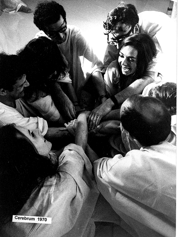 Schon mit der Ankündigung ihres neuen Stücks „Cerebrum“ (1970) bereitete die „Bühne“ die Zuschauer auf ein außergewöhnliches Theatererlebnis vor: "CEREBRUM ist keine Theateraufführung und kein Cabaret: Es gibt keine Schauspieler und keine Zuschauer. Am CEREBRUM nimmt jeder teil. Deshalb wird nur derjenige das persönliche und tiefe Erlebnis im CEREBRUM erfahren, der die innere Bereitschaft mitbringt, erleben zu wollen und offen zu sein für jeden Impuls. Und nur dann wird es möglich sein, CEREBRUM voll auszuschöpfen: „high“ zu sein ohne Alkohol, Nikotin, Hasch und LSD; vorzudringen in die vielschichtigen Bewusstseinsstrukturen." Vor dem Betreten des eigentlichen Aktionsraums wurden die Zuschauer gebeten, ihre Privatkleidung abzulegen und ein für sie bereitgehaltenes poncho-artiges Gewand überzuziehen. So auch schon äußerlich den eigentlichen Akteuren gleich gemacht, betraten sie den Ort des Geschehens. Eindrucksvoll beschrieb der Theaterkritiker der „Rheinischen Post“ (vom 21. Januar 1970) sein Erlebnis der Aufführung: "Weiß bemäntelte Gestalten sitzen, hocken oder liegen im Dämmerlicht absichtslos verteilt, japanischer Koto-Musik über Stereo-Lautsprechern lauschend und meditierend. Geräusch-Instrumente werden verteilt. Ein Rhythmus, von irgend jemand auf den Boden geklopft, verführt zum rhythmischen Mitmachen – die Grenze zwischen „Akteur“ und „Zuschauer“ ist aufgehoben. Wenn das inzwischen aufgehellte Licht zurückgeht, füllt ein sich langsam erregendes Atmen den Raum, das in ein exotisches Lied übergeht. Stab-Batterie-Lampen werden verteilt, und jeder beteiligt sich an „Lichtspielen“ (in des Wortes erster Bedeutung). Ein großer weißer Ballon lädt zum In-die-Luft-Stupsen ein, und plötzlich rollen von allen Seiten Orangen über den weißen Fußboden. Jeder schält und isst sie. Von den „Akteuren“ iniziert, geht die Ruhe des gemeinsamen Apfelsinen-Essens in Tanzbewegungen über. Kleine Doppelspiegel werden ausgegeben; mit dem einen Auge sieht man sich selbst, mit dem anderen einen beliebigen Partner. Vaselin- Creme, in beide Hände verteilt, führt zu gegenseitigem Hände-Glitschen, zu Dritt-, Viert- oder Mehr-Personen- Kontakt. Das also ist „Cerebrum – Theatre of Your Mind“, Gegenpol des „Happening“, Verschmelzung von Spielern und Mitspielern, Erweckung des „homo ludens“ in Erwachsenen." |