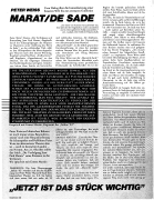 1982 brachte die „Bühne“ wieder ein vorgegebenes Stück eines modernen Autoren zur Aufführung. Gezeigt wurde „Die Verfolgung und Ermordung Jean Paul Marats, dargestellt durch die Schauspielgruppe des Hospizes zu Charenton unter Anleitung des Herrn de Sade“ von Peter Weiss. In einem Interview erläuterte Ernest Martin die Gründe für die Abkehr von dem Weg der Eigenproduktionen: „Nach zehn Jahren, in denen wir hier drei eigene Stücke produziert haben, wurde mir klar, dass wir nun keine eigene Produktion beginnen konnten, ohne uns zu wiederholen. Auch bei neuen Themen und Ideen bleiben die gewohnten Arbeitsmethoden. Das Abenteuerliche und Überraschende bleibt nach 10 Jahren aus. Was bleibt, ist Routine. Gerade das habe ich an den großen (etablierten) Häusern immer kritisiert. Erstaunt musste ich erkennen, dass es auch uns passieren könnte, dieses Erstarren. Das hieß jetzt für uns, ein schon geschriebenes Stück zu machen“ („Überblick“ vom Oktober 1982). Die Idee von Peter Weiss, de Sade als Theaterinitiator auftreten zu lassen, geht auf die Aufführungen zurück, die de Sade leitete, als er in der Irrenanstalt Charenton bei Paris von 1803 bis 1814 interniert war. De Sade war dort wegen sexueller Ausschweifungen und seiner skandalerregenden Schriften. Dort führte er auch seine selbstgeschriebenen und selbstausgestalteten Dramen auf. Die Rollen waren mit Insassen der Heilanstalt besetzt. „Was uns in der Konfrontation von de Sade und Marat interessiert, ist der Konflikt zwischen dem bis zum Äußersten geführten Individualismus und dem Gedanken an eine politische und soziale Umwälzung“, kommentierte Weiss seinerzeit bei seiner Premiere 1964 das eigene Stück. Zu der Inszenierung der „Bühne“ schrieb die „Rheinische Post“ (vom 22. Oktober 1982): "Das von Peter Weiss geschriebene, vor allem wegen seiner Theatereffekte weltberühmt gewordene Drama wird von der „Bühne“ erstaunlich verhalten gespielt. Dies mag teilweise an der vor allem auf Sprachdisziplin und rhythmische Bewegung ausgerichteten Regie von Ernest Martin liegen. Selbst in den Szenen, als das Spiel mit den „Verrückten“ Ernst zu werden droht, wo sie quasi den Aufstand proben, bleibt eine – glänzend einstudierte – Choreographie erkennbar. (...)Die Schreckensherrschaft des Volkes wird von Wolf Gericke in der Rolle des dem Individuum und seinen elementaren Lustgefühlen verhafteten Marquis eindringlich beschworen. Ganz souverän, auch sprachlich völlig unverkrampft, Willi von Hoegen als sich unter körperlichen wie psychischen Schmerzen windender Marat. (...)Auch die vielen Nebenrollen blieben den ganzen Abend konzentriert. Eine Leistung, die nicht jedes Stadttheater vorweisen kann. Viel Applaus für Amateurschauspieler, die sich professionell benahmen." Der Kritiker der „Neuen Ruhr Zeitung“ (vom 23. Oktober 1982) empfand die Auswahl des Stücks als für die „Bühne“ besonders geeignet: „Mit dem Weiss`schen Marat haben sie sich zweifellos ein Stück gewählt, dass ihrer gruppenspezifischen Dramaturgie sehr nahekommt: Clowneske, zirsensische Verfremdungen, grelle, manchmal plakative Ironie, Radikalität in Aussagen und Aktionen, zynische Brechung von Sentimentalitäten. Und wieder gelingt es Ernest Martin, in der diesmal riesigen Truppe von Amateuren und Laien Individuen sichtbar zu machen, aus persönlichen Prägungen enorme Spielwirkung entstehen zu lassen.“ |